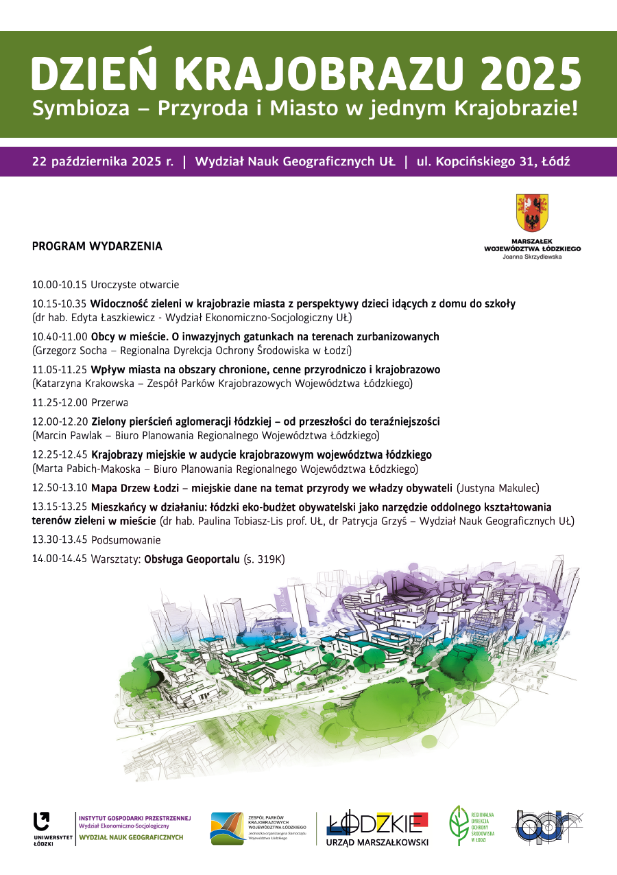 Zapraszamy wszystkich studentów oraz pracowników Instytutu Gospodarki Przestrzennej na kolejny już Dzień Krajobrazu. W tym roku wydarzenie pt. “Symbioza - przyroda i miasto w jednym krajobrazie!” organizowane jest przez nasz Instytut wspólnie z Wydziałem Nauk Geograficznych, Zespołem Parków Krajobrazowych Województwa Łódzkiego, Urzędem Marszałkowskim Województwa Łódzkiego, Regionalną Dyrekcją Ochrony Środowiska w Łodzi oraz Biurem Planowania Regionalnego Województwa Łódzkiego. Wydarzenie patronatem objęła Marszałek Województwa Łódzkiego Joanna Skrzydlewska.